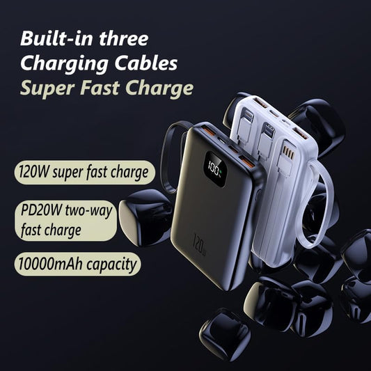 120W Mini Power Bank Built in 3 Cables 10000 mAh Portable Charger with LED Indicator Mini Fast Charging Power Bank for Cell Phones(Black)