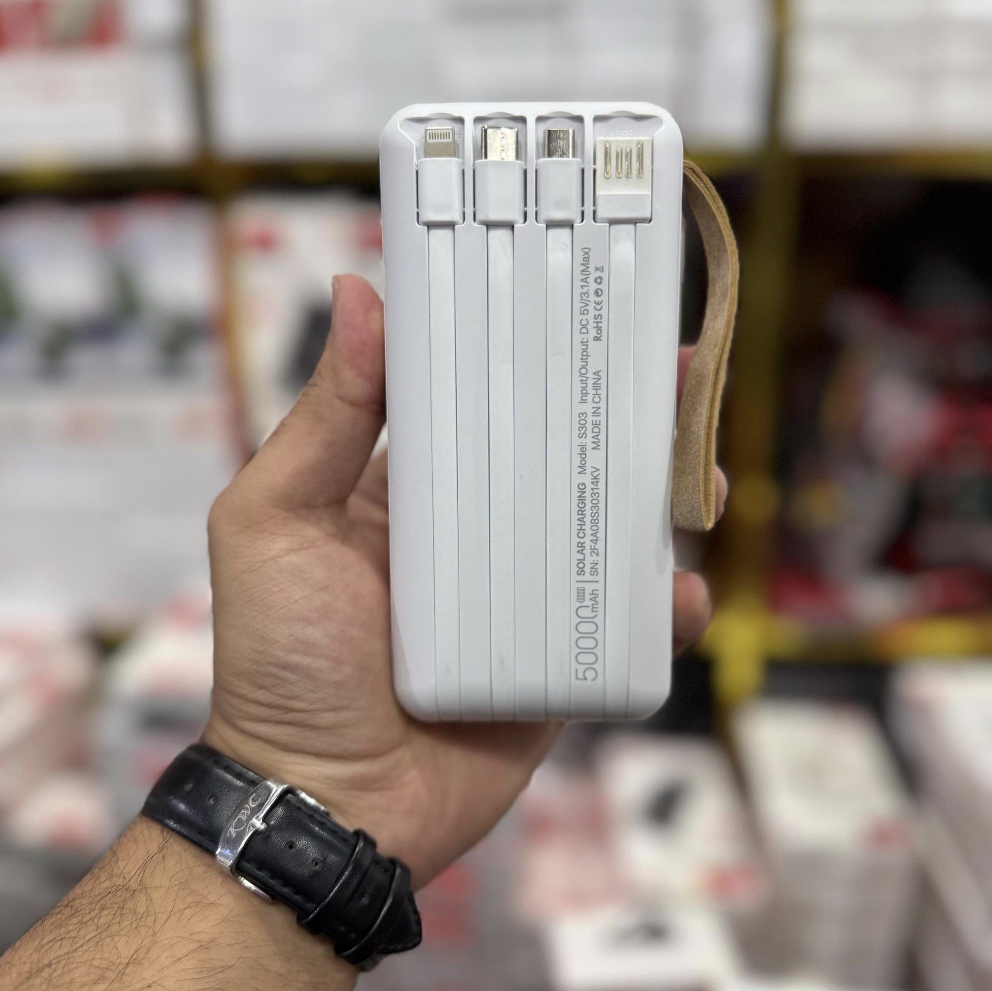 Built in Cables : This Power bank is attached with 4 built in cable such as type c, Micro, and lightening cable and additionally their is direct electrical Port.