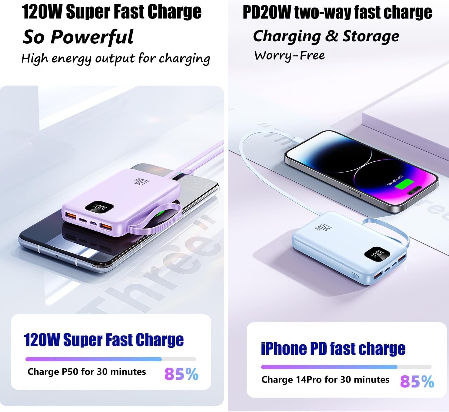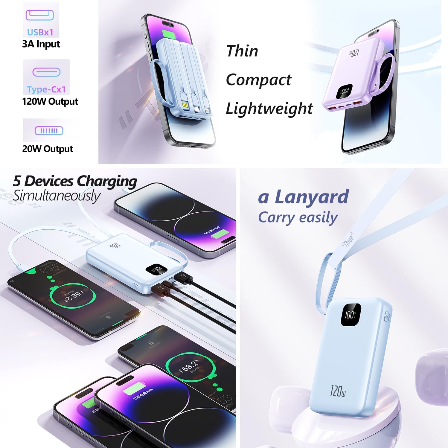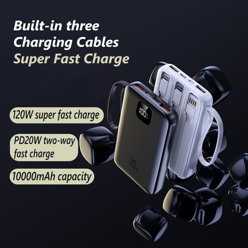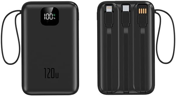 - ⚡【Built-in 3 Cables for charge and 120W Super Fast Charge & PD20W two-way Fast Charge】Built-in 3 cable, Type-C output cables and 1 USB input cable. 120W & PD20W two-way super fast charge,excellent compatibility of power bank can charge almost cellphones devices. (This power bank can solve the trouble of carrying cable when you go out!! )