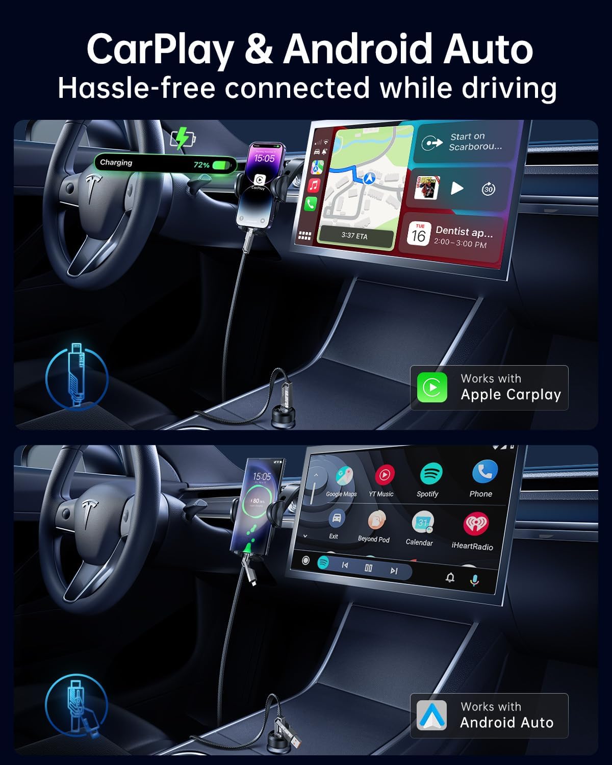 Apple CarPlay & Android Auto Support: Fully compatible with Apple CarPlay and Android Auto systems, ensuring a stable connection during your driving journey. Note: Verify your vehicle supports CarPlay before use.